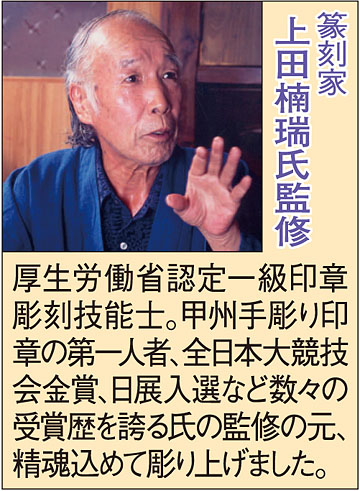 古より霊石とされ、幸運を導くと伝えられる神秘的な魅力あふれる水晶に生まれ年による十二支御本尊を精緻に彫刻した守護印鑑です。自分に定められた守護本尊を身につけていると災厄は退けられ、御仏の偉大なご加護が授かるとされています。また、この印鑑の姓名は篆刻家として40年以上の経験を持つ上田楠瑞氏監修の元、古来より運気を呼ぶとされる風格ある八方篆刻書体で精魂込めて彫り上げています。お客様の御守り本尊と名前を一緒に彫刻したこの守護印鑑を身につけて、あなたの開運、運気上昇を祈願してください。