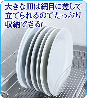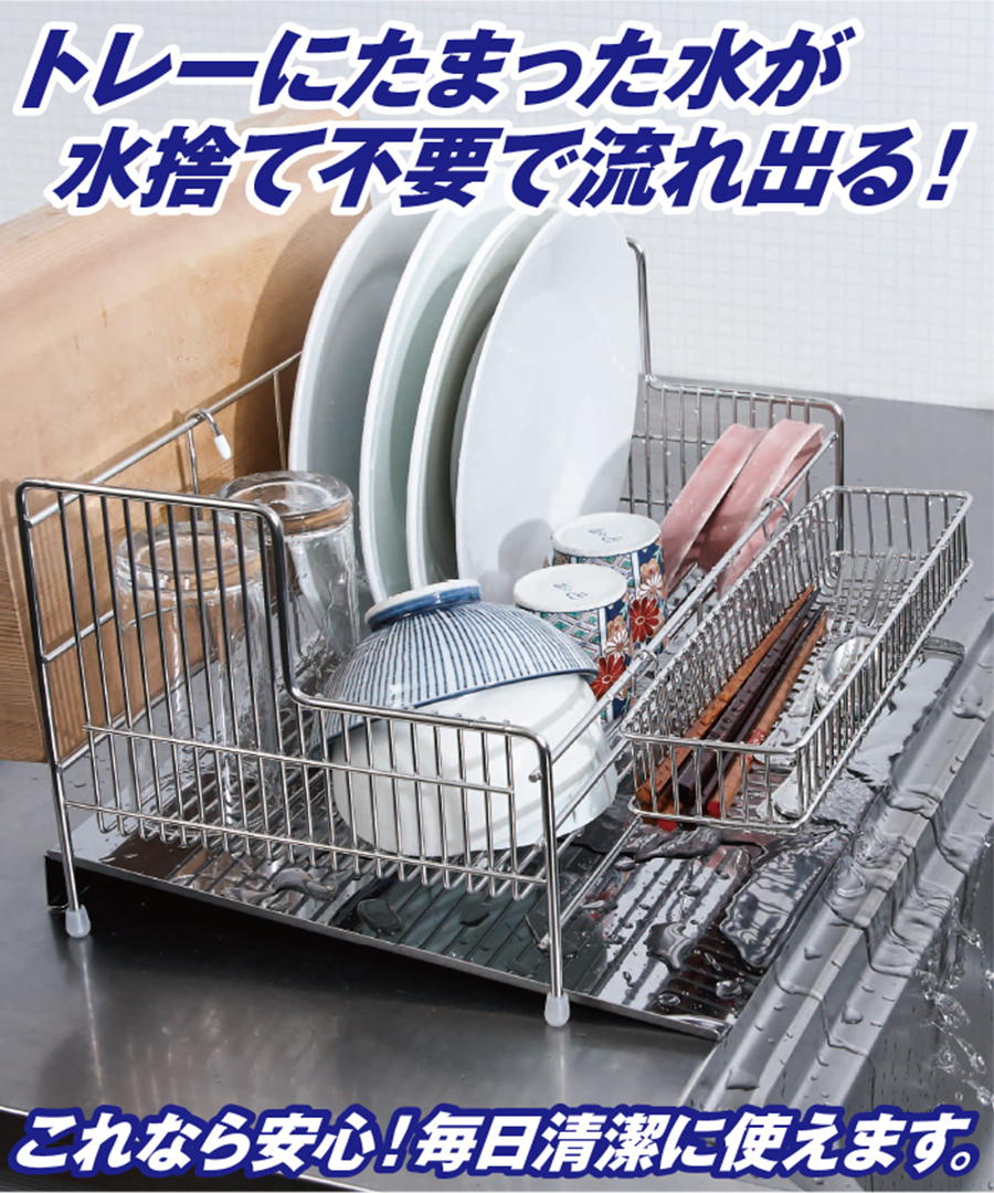 水切りのトレーに溜まった水は不衛生だけど、こまめに水を捨てるのが面倒…。そんなご不満をお持ちの方にぜひおすすめしたいのがこの水切りラック。この水切りラックはトレーに傾斜がついていますので、洗った皿やグラスについた水がそのままシンクに流れ出します。これなら水を捨てる手間もなく毎日清潔にお使いいただけます。さらにラックの奥行は23.2㎝なのでシンク横のわずかなスペースで使えます。材質は錆びにくいステンレスを使用していますので水漏れも安心。箸置きやまな板立てをラックの外側にセットしていますので、食器を広々置くことができます。また、網目を細かく設計していますのでコップを立てて置いても安心感があります。大きい皿は網目に差して立てられ、スペースも有効利用できます。毎日の食器洗いもグ~ンとラクに手間いらずで清潔に使える水切りラックをぜひこの機会にお求めください。