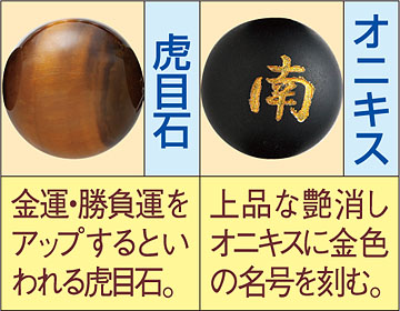 仏教それぞれの宗派のありがたい御名号(お題目)を彫り込み。ありがたい腕輪と念珠を一つにしました。御名号は4種類でほとんどの宗派にお使いいただけます。オニキスの中に金色に刻まれた名号は仏の守護と功徳を持ち主にもたらすとされています。また、信仰心の表れとして心に平安をもたらし、祖先を敬う心ももたらします。古来より魔除けの石とされる漆黒のオニキスは丁寧に艶消しを施し、使い込むほどに味がでる仕上がりです。親玉と子玉の三天には光沢が美しく、金運パワーとして人気の虎目石を配しています。このありがたいお守り腕輪念珠を美しい桐箱に収めてお届けします。あなたの宗派の名号をお選びになり、お好みのサイズをご指定ください。