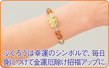 ふくろうは「福来郎」「不苦労」などと言われ、かわいらしい縁起物として定評があります。その人気のふくろうが三羽並んだブレスレットで目にはエメラルド、ルビー、サファイアの三大宝石が輝く贅沢な仕上げです。ふくろうはシルバー925の金色仕上げ。エメラルドは知力を高める、ルビーはエネルギーを高め厄を払う、サファイアは礎を強めるといわれ、安定した財運をもたらすことでしょう。また、シトリンやルチルクォーツという財運にちなむパワーストーンをふんだんに使用。いつも身につけて金運厄除け招福をご祈願ください。