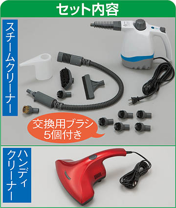 汚れが気になった時が、お掃除時!手軽に使えるハンディタイプの掃除機とスチームクリーナーのセットです。掃除機は床や机の上はもちろん、布団やカーテンやソファなどにも使え、目に見えるゴミだけでなく、アレルギーの原因となる花粉やダニまでグングン吸引。いつも清潔で健康的に過ごせます。浴室やキッチンなど水回りの掃除は、スチームクリーナーにおまかせ。タイル目地の汚れなども、ガスコンロの油汚れも、高温スチームの威力で驚くほど簡単キレイに洗い落とせます。豊富なアタッチメントで、窓ガラスや網戸の掃除にも大活躍。この2台があれば、思いついたときサッと取り出し、アッと言う間に家中ピカピカに。1個あたり7,950円というお値段も見逃せません。今すぐお申し込みください。