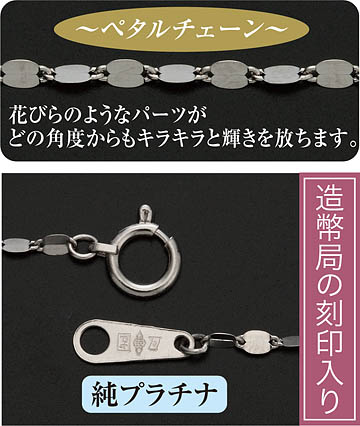 ご自分へのご褒美に、一生もののジュエリーはいかがでしょうか。本当の本物だけが持つ永遠の輝き!贅沢な純金、純プラチナのネックレスを同一デザインでご用意いたしました。丈夫な小豆チェーンにハンマリングを施した、気品あふれるペタルチェーンのネックレスで、花びらのようなパーツがらせん状につながり、どの角度からもキラキラとまばゆい輝きを放ちます。着ける方の胸元を華やかに彩る高貴なまでの光の饗宴は、周りの視線を集めずにはおかないでしょう。チェーンの長さはゆったりサイズの50cmで、着け外しもラクラク。べーシックなデザインですので、パーティーなどの晴れやかな席から普段のおしゃれまで、シーンや装いを選ばずご使用いただけます。
