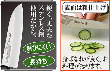 古来より中国では皇帝のシンボルとして扱われてきた、伝説の神獣である龍。雷鳴を轟かせながら天に昇る姿は、特に昇り龍と謳われ、厄を除け運を開くと信じられてきました。その縁起のよい昇り龍の絵柄を刃に彫り込んだ、厄除け開運包丁のご紹介です。刃は鋭い切れ味を持つ、コバルト合金鋼を使用。家庭用の最適な厚さにし、固い肉でも魚でも軽い力でスパッと切れます。刃の表面を粗仕上げにしてありますので、身離れがよく、野菜などもトントントンと調子よく刻め、調理するのが楽しくなるほどです。毎日使いながら厄除け開運祈願になるのも、昇り龍を彫り込んだこの包丁のうれしいポイント。厄を切るという意味合いから、お嫁入り道具や結婚祝いの品としても人気を博しています。