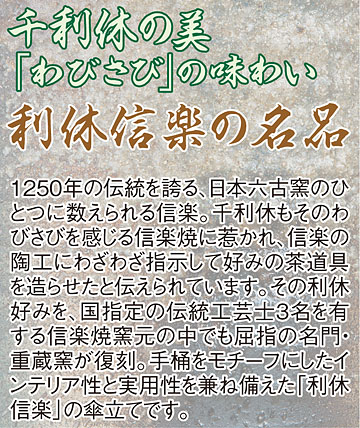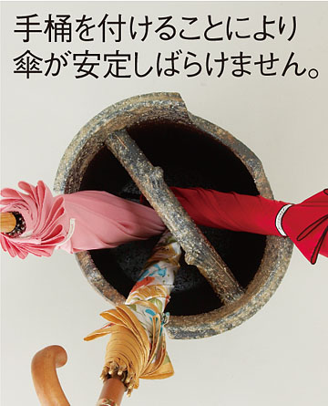 茶道具に独自の審美眼を持っていた茶聖・千利休。彼が世に広げた「詫び寂び」は、日本独特の美意識として現代まで受け継がれてきました。当時、利休が惚れ込んだのが信楽焼で、陶工に指示してわざわざ道具を造らせたともいいます。その往年の利休好みの作風を現代に復刻した「重蔵窯」の自信作。信楽焼特有の温かみのある色と肌、趣深い佇まい、そしてずっしりとした重厚感が見事で高級感を漂わせます。茶の湯にも通じる手桶をモチーフにし、取手を付けることで生まれる変化のあるデザインが目を引き、入れた傘が倒れるのを防ぎ、安定させる実用性も兼ね備えています。和風・洋風どちらの玄関にもさりげなく馴染んで、お客様へのおもてなしにも一役買うこと請け合いです。古き良き日本の伝統美を暮らしの中に取り入れて、あなたも毎日を心豊かにお過ごしください。