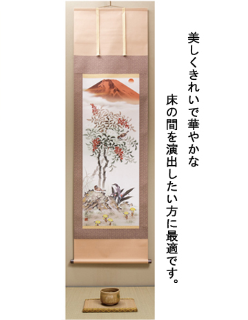 新しき年を迎える季節。床の間や玄関など家の大事な場所に縁起のよい掛軸を飾り、家運隆盛を祈願されてはいかがでしょうか。ご紹介するのは、古来より「難を転じて福と為す」に通じるといわれ尊ばれている「南天福寿」を中心に、開運の象徴とされる「旭日」「赤富士」、さらに難を啄む「夫婦雀」、長寿を顕わす「万年青」など、吉祥絵柄の数々を一幅に収めたお目出度尽くしの逸品です。品質保証付きの日本製で、末長くご愛蔵いただけます。