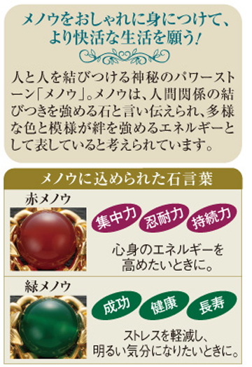 独特の色と、同じ模様が世界に2つとない、美しい色合いのメノウ。今回は、そんな唯一無二の魅力を持つ、赤メノウと緑メノウをペンダントにしてご用意しました。鮮やかな色合いのメノウを囲むように、貴金属で作られた花々は可愛らしくて印象的。さらに、3つのダイヤモンドの輝きをアクセントとしてプラス。シンプルな中にも、個性的なメノウがさりげなく存在感を主張する、魅力的なペンダントに仕上げてあります。ショッピングはもちろん、フォーマルなシーンなど、活用範囲が広いのも魅力。古来から、メノウは「絆」を深める石と言われ、家庭運や家族運を高め、人と人のつながりを強くしてくれる石と言い伝えられてきました。神秘の力を持つメノウを胸に、大切な人と、さらに強い絆で結ばれること願うのも楽しみなペンダントです。