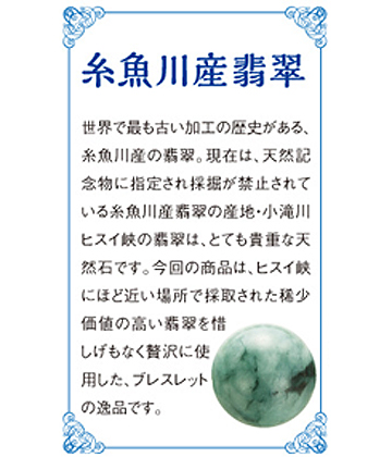 今では入手困難な新潟県の糸魚川産翡翠を使った、贅沢なブレスレットです。天然記念物に指定された糸魚川産翡翠の産地・小滝川ヒスイ峡。その近隣で採取された、良質な翡翠を使用。糸魚川産の翡翠には、輝くように白い石の中に、わずかにクロムを含む鮮やかな緑色が入った乳緑色が特長で、市場に出回る量が少なく、稀少価値が高いことで有名です。また、翡翠は古くから世界中で“魔法の石”として崇められてきました。日本では縄文時代から勾玉に使われ、「忍耐」「飛躍」「調和」を表す石として言い伝えられ、持つことで叡智が授かり、優れた人徳をもたらすと言われてきました。さらに、アジアでは「あらゆる成功と繁栄」を意味する石として尊ばれてきました。そんな、神秘のパワーを秘めた翡翠のブレスレットを肌身離さずお持ちになり、さらなる開運を祈念してください。翡翠のエネルギーが、運気上昇の扉を大きく開け放ってくれることでしょう。