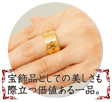 財運石と風水の開運術の組み合わせにより、金運上昇を強力に祈願できる開運リング。その黄金色の輝きから古くから財運・金運を招くとされてきた貴重な財運石「黄水晶」を贅沢に4石も配した豪華仕様。中央には、風水の易経で用いられる六十四卦の中で隆盛な運気を表す14番目の掛「火天大有」の意匠を刻印。宝飾品としての美しさも際立つ逸品です。金運上昇祈願のお守りとして身につけて大きな幸運をお引き寄せください。
