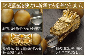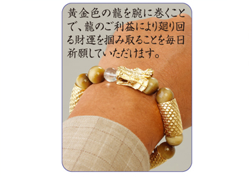 龍は強さや聡明さを表す「聖獣」とされ、古くから中国では皇帝の象徴として扱われてきました。空を勇壮に駆け巡るその姿から天を支配する神ともされ、日本各地で龍神として崇められています。風水では、あらゆる運勢を呼び込むとされ、特に黄金色の龍は金運、財産運、出世運に効果があるといわれています。その龍をモチーフにした豪華さあふれるブレスレットのご紹介です。まず目を引くのは、神々しく風格にあふれた黄金色の龍。これを腕に巻くことで、龍のご利益により廻り回る財運を掴み取ることを毎日祈願していただけます。さらに龍の継ぎ目には金運を招くという「金虎目石」を配し、ジルコニアの目を輝かせ、いかなる望みも叶えてくれるという宝珠に見立てた水晶を龍が今まさに飲み込もうとしているかのような勇壮なデザイン。龍の鱗の内側にも水晶を配し、厄除のお守りとしても重宝します。まさに財運隆盛を願うにふさわしい意匠。あなたもぜひ腕に巻き、途切れることない財運の向上を祈願し、幸せに満ちた日々を過ごす拠り所としてください。M、Lどちらかのサイズをご指定の上、お申し込みください。