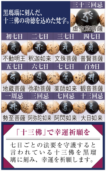 主珠に、星月菩提樹をあしらい、家内の繁栄を招くとされる十三佛の功徳をそれぞれの梵字に込めた念珠です。百八の主珠の一部に、十三佛の中で初七日から十三回忌までの梵字を黒瑪瑙にあしらい、さらに、母珠の黒瑪瑙に三十三回忌を司る虚空蔵菩薩の梵字を刻み、初七日から三十三回忌に至るすべての法要に最適な念珠に仕上げました。そのほかの主珠にはお釈迦様が木の下に座して悟りを開いたと言われる菩提樹の実“星月”を贅沢にあしらいました。念珠は、法要の際はもちろん、日頃から肌身離さず持つことで、無量の幸福と家運隆盛などの功徳が授かり、魔除けや厄除けのお守りとして貴家を守護してくれると言われています。ぜひこの「十三佛百八念珠」をお持ちになり、貴家の繁栄と平穏を祈念してください。