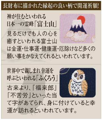 京都の熟練職人が、上質な金襴糸で吉祥な図案をあしらった2つの長財布のご紹介です。一つは、世界文化遺産に登録された名峰・富士山に日の出の太陽が描かれたおめでたい財布です。富士山は、古来より神が住む日本最高峰の霊峰として多くの人に尊ばれ、夢に見ると大変縁起の良い山として知られています。そしてもう一つは、吉祥な動物として日本はもとより世界中で親しまれているふくろうをあしらったかわいらしい財布です。ふくろうは夜行性で夜目が利くことから“世間に明るい”という意味や、“福来郎”や“不苦労”といった当て字があてられ、海外では金運上昇を願うシンボルとしても親しまれています。今回は、その2つの図案が描かれた財布の逸品を、開運祈願の気持ちも込めた2個組でご提供いたします