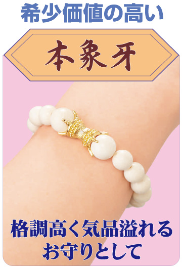 希少価値が高く木目が美しい本象牙を使用したブレスレットです。艶やかで優しい質感と乳白色で象牙の美しさは歳月が経つにつれ、よりいっそう深まっていきます。象牙は適度の硬さで印鑑などの彫刻材として珍重されてきましたが、像はインドでは神の使いとして崇められ、古来の日本でも珍しい動物として豊臣秀吉や徳川家康にも贈られたりしています。その象牙のブレスレットに密教で最高の法具とされる五鈷杵をあしらいました。五鈷杵は煩悩を破壊し、菩堤心を表す代表的な法具で、様々な厄災から身を守り、幸運をもたらすといわれています。手杵に似て両端が五叉になっていることからこの名称になり金色仕上げにしたことで、まばゆい輝きが秘めたパワーを感じさせます。上質感あるブレスレットとして、お守りとしていつも身につけ毎日をお幸せにお過ごしください。