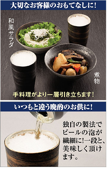 これがあるから明日もがんばれる。そんなささやかで大切な楽しい晩酌タイムを、もうひと味おいしくする、ビアグラスとボウルのペアセットをご紹介します。落ち着いた陶器の地色に、華やかな金と銀をそれぞれ刷いた、見た目もゴージャスで美しい、しっくりした手ざわりを持つ有田焼の逸品です。ビアグラスの内側は、釉薬を吹き付ける独自の技法により微妙な凹凸が生まれ、その凹凸がビールの味を繊細になめらかにします。飾り鉢として置いても美しいほどのボウルは、ご自慢の手料理を一層引き立ててくれるはず。仲良くふたりで囲むテーブルをおいしく華やかに演出するペアセットで、さあ今夜もカンパ~イ!