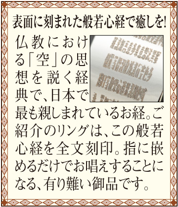軽い・強い・錆びない・美しいといった数々の特性を持ち、さらに金属アレルギーの心配もない!魅力的な素材のチタンを使用。卓越した職人の技が造り上げた、ジュエリー好きには見逃せない貴重なリングです。さらにチタン表面には、叡智の結晶である般若心経の全文276文字を刻印。デザイン的にも美しく、指に嵌めるだけで不思議と心が和みます。チタンの輝きで指元を美しく彩りながら、般若心経の功徳によって厄落としも期待できる逸品です。