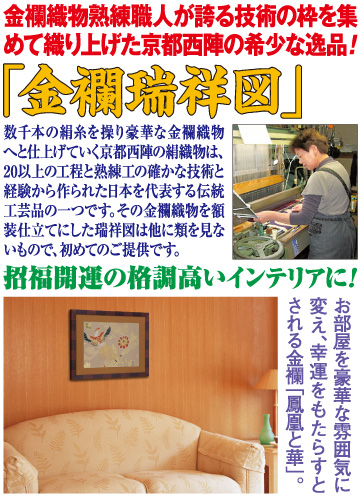 京都西陣の伝統の絹織物を代表する「金襴」の額装仕立てのインテリアです。室町時代より続く日本の伝統工芸品の金襴織物は20年以上の熟練職人が数千本の絹糸を使って仕上げた逸品。古くから帯や袋物、表具地、能衣裳などの特別な織物として用いられ、キラリと輝く金糸が際立つ豪華な文様です。中国で麒麟、竜、亀とともに霊獣とされる瑞鳥の鳳凰は雄を鳳、雌を凰といわれています。首は蛇、尾は魚、あごは燕、くちばしは鶏、背は亀に似て五色の羽を持つとされ、瑞祥文様として装飾や絵画などに用いられてきました。その鳳凰に華やかな花を配しためでたい図柄は一家の幸運を象徴するインテリアとして最適です。リビングや客間などに飾って格調高いお部屋の雰囲気を醸し出します。伝統の金襴織物を高級感ある木製額装仕立てとして初めてのご提供。いままでにない新しいインテリアとして、新築祝いや開店祝いなどの贈り物や記念品としてもおすすめです。
