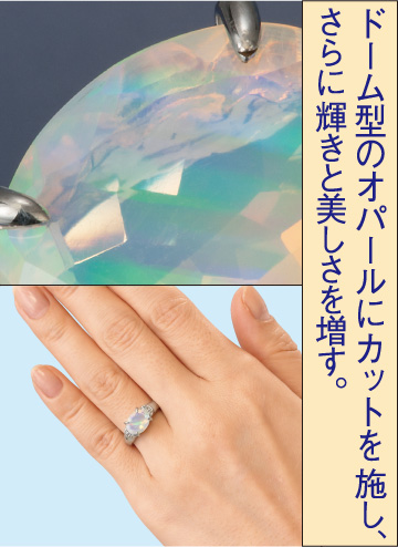 光の加減によって様々に色を変化させる独特の美しさで人気のオパール。虹色石とも呼ばれる幻想的な色と輝きを持つオパールにオーバルカットを施すことにより、さらに煌めきと美しさを増したリングです。色と輝きがさらにクッキリ。1カラットのオパールに、きらっと輝くダイヤ4石をあしらい存在感はひときわ。オーロラのような神秘的な美しさが指先を華やかに演出します。
