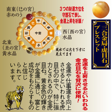 1つ身につけるだけでも強力な金運祈願となるブレスレットを、2本重ねて身につければ2倍の金運上昇が期待できる、強力な金運祈願のブレスレット2本組です。1本は風水最強の財運方位である「三合金局」を取り入れ、さらに財運石として知られる虎目石の中でも特に力を発するといわれる「金虎目石」を連ねた逸品。風水において南東(巳)、西(酉)、北東(丑)は「三合金局」と呼ばれ、この3つの方位に守られた者は強大な金運を授かるといわれています。この金虎目石のブレスレットは、南東に赤めのう、西に水晶、北東に黄水晶という座宮の守護石を配し、金運上昇を強く祈願できます。もう1本は七福神の紅一点であり、蓄財の女神として知られる弁財天の遣いとして古来より崇め奉られてきた有難い白蛇を親珠の水晶に彫り込んだもの。水晶は総ての邪気を払い清浄をもたらすといわれ、見た目も美しく身につけるだけで気持ちが癒されるとともに、弁財天の遣いである白蛇の霊気により強力に金運を祈願できます。どうぞ今すぐお申し込みになり、風水の運気と白蛇の霊気が合わさった祈願力で2倍の金運を招き寄せ、絶大な富と成功を祈願してください!