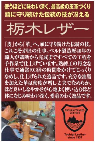 貴方を粋な男に演出してくれる極厚の「栃木レザー」製のベルトをご紹介します。匠の技が冴えるベルト製造歴40年の熟練ベルト職人の丹念な仕事により作り上げた肉厚の牛革ベルト。肉厚なのにしなやかな「多脂皮革」は植物タンニンを使用し、通常の3倍にあたる約1ケ月半をかけてじっくりなめした逸品。充分な油脂を加えているので革の密度が 増し丈夫でなめらか。原皮厚5ミリの一枚革は主に馬具などに使用され、しなやかさがありながら耐久性にすぐれています。シンプルなデザインながら存在感のあるバックルに牛革のしなやかな肉厚感。シックで上質、高級感漂う一本に仕上げました。カジュアルからビジネスまで様々な装いに幅広くお使いいただけます。お色はブラックとチョコをご用意しました。たっぷりとオイルがしみ込んだ丈夫なベルトはほど良いしなやかさが心地良く、使うほどに体に馴染んでいきます。是非長くご愛用頂き、自分だけの一本を育てててください。
