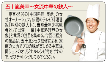 マスコミで大活躍の女流中華の鉄人・五十嵐美幸シェフが監修した、家庭の火力でプロの味が楽しめる中華鍋です! その秘密は、熱伝導のよいアルミダイキャスト製で、3.5mmという厚底仕様。鍋の温度を均一に上昇させ、食材を入れても温度が下がりにくく、高温状態を保ちます。さらに、鍋全体の熱が使える8.5cmという深さで、食材が飛び散りにくく、食材を回すことで広い側面の熱も利用。短時間で熱が通り、料理店で味わうようなしゃきっとした仕上りになります。厚底ながら軽く、非力な高齢者や女性でも片手でラクに扱えます。たっぷりの深さで、炒め物はもちろん、煮込み料理などもお手のもの。便利な自立するガラス蓋付きで、料理の仕上り具合も一目瞭然です。五十嵐シェフ自慢のオリジナルレシピを添えて、お届けします。