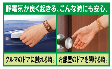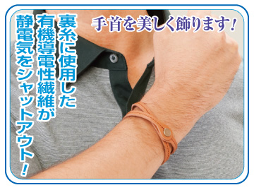 乾燥する季節になるとよく起きる、パチッとして不快な静電気。防止するブレスレットを探してみたけれど、お気に入りが見つからなくて…。とお嘆きの方のためにご用意したお洒落な商品です。素材に上質な牛革を使用した2重巻きのブレスレットで、裏糸に静電気を安全に取り除いてくれる特殊繊維を使用。静電気が起きるかもしれないドアノブなども、気軽に安心して触れます。また、素材の牛革は使い込むうちに柔らかくなり、色合いが変化して愛着が湧くのもうれしいポイント。上品でシンプルなデザインは、お手持ちの腕時計やブレスレットと重ねてつけてもお洒落にキマります。この秋は、様々なコーディネイトに合わせやすい、ブラウンとキャメルをご用意。今注目の新商品ですので、ぜひお試しください。