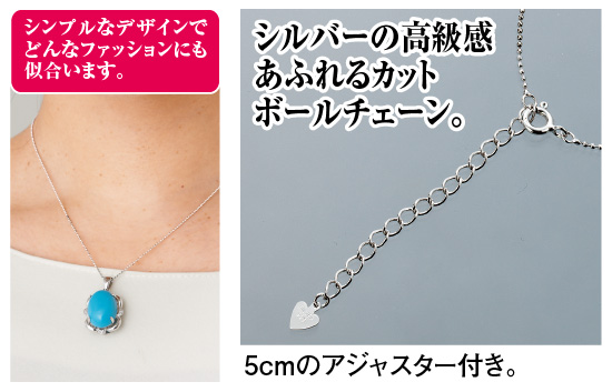 マンネリ化したファッションに、アクセントをプラスしたいとき、美しいカラーのアクセサリーがあると便利。そこでおすすめなのが、鮮やかなターコイズブルー色のギブサイトのペンダント。黒や白などのオーソドックスな色の服に爽やかさを添え、顔まわりに若々しい明るさをもたらしてくれます。ギブサイトとは、岩の風化作用によって生まれた鉱物。大自然の息吹を感じさせる天然石で、浄化の色とされるターコイズブルーが心をリフレッシュさせてくれるといわれています。また、この色はコミュニケーションをサポートするともいわれ、良好な人間関係を築く運気をもたらしてくれるかもしれません。石の周りにダイヤモンドを4個、合計0.02カラットをあしらい、上品なカットボールチェーンを採用。かしこまり過ぎないお洒落なデザインなので、出番の多いアクセサリーになるはずです。