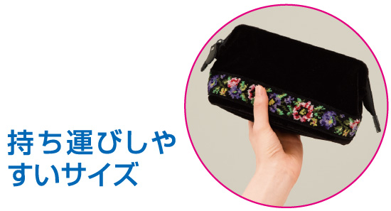 ヨーロッパの伝統の織物としてその繊細で優美な織りと豪華な仕上がりの定評のあるシェニール織りの化粧ポーチです。持ち運びしやすいサイズで、開閉口の縁にワイヤーを入れていますので、ガバッと開いて収納はスムーズ。ポーチを開いたままメイクができます。約8cmのマチ付きで、化粧品が多くてもたっぷり収納。6つのポケットには少し大きな化粧ボトルやブラシからリップスティックなどの小さな化粧品までスッキリ収納、きちんんと整理整頓できます。2個組なので一つは自宅に置いて、一つはお出かけ用として便利に使い分けることができます。