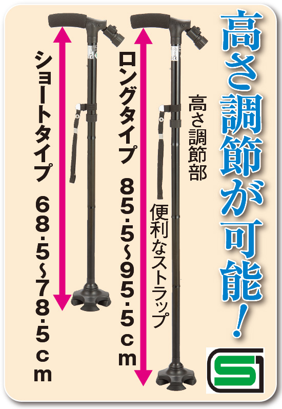 歩くときはもちろん、立ち止まった時にも使い勝手の良い便利なステッキのご紹介です。ヘッドが4つに分かれているので接地面が広く、手を離せば自立するのが特長。地面や床に立てられるので、お買物などで両手を使いたい時に重宝します。しかも、ヘッドは旋回式で、階段や坂道、砂利道も安心して歩けます。また、ステッキはコンパクトに折りたためるので、使わない時はバッグにラクラク収納。しかも、軽量なので旅行やレジャーに持ち歩く際にも便利です。グリップは握りやすいウレタン製で、先端には角度調節が可能なLEDライトを装着。暗い夜道や廊下を照らし、停電時にも活躍します。一般財団法人製品安全協会が定めた基準に適合したSGマーク認証商品なので、安全性は折り紙付き。今回はロングタイプとショートタイプをご用意しましたので、お好みの2本がお選びいただけます。