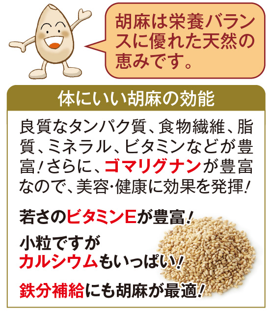 古くから不老長寿をかなえる食品として崇められてきた胡麻ですが、本格的な研究が始まったのはここ30年ほど。胡麻にしか含まれない特有成分「ゴマリグナン」が豊富。さらにたんぱく質、食物繊維、脂質、ミネラル、ビタミンと胡麻は総合栄養食。でも胡麻だけを食べるのはちょっと無理。そこでご紹介するのがこの胡麻フィッシュ。手軽におやつ感覚で胡麻の成分をまるごと摂ることができ、しかも瀬戸内近海で捕れた小魚を散りばめカルシウムをさらにプラス。ごまの健康効果を実感する摂取量の目安は1日に大さじ1~2杯、10~20gです。この 「胡麻フィッシュ」1個に約725粒の胡麻が入っていますので、1日5個程度お召しあがりいただくだけで必要な栄養を簡単に摂ることができます。健やかな毎日のため、ぜひ常備食としてご利用ください。