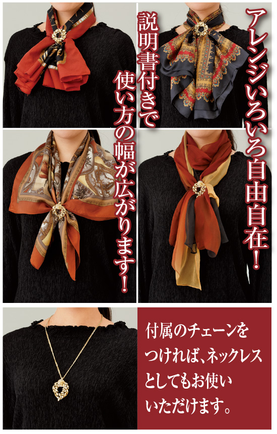 スカーフが大流行し、女性の必需品に近いものだった頃、アクセサリーショップではスカーフをお洒落に留める様々なスカーフ留めが並び、春や秋には飛ぶように売れていたそうです。再びスカーフが流行している今、スカーフ留めもその魅力が見直されています。美しい輝きのスワロフスキーR・クリスタルをふんだんに使用したゴージャスなスカーフ留めの2個セットです。華やかで可愛らしい楓と、しっとりとした女性らしさを持つ枝垂れ柳のモチーフがそれぞれ個性的かつさりげなくオシャレを引き立てます。使い方は簡単。リングにスカーフを通してクリップで挟むだけです。ブローチのように穴を開けることがないので、大切なスカーフや洋服にも安心してお使いいただけますね。ワンポイントに留めるだけでも楽しめますが、スカーフと合わせると様々なアレンジが楽しめ、使い方は無限大。アレンジの説明書もおつけしますので、お手持ちのスカーフをさらにお洒落に楽しんでいただけます。さらに付属のチェーンにつなげれば存在感のあるペンダントに。スカーフと合わせて、またペンダントとして、これからの季節のおしゃれにかかせないものになりそうですね。是非この機会を逃さずお買い求めください。
