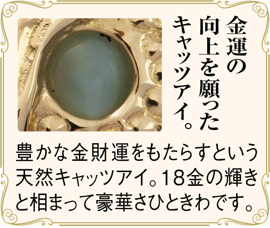 まばゆい18金の輝きを放つ価値あるリング。「福籠(福がこもる)」「不苦労」などに通じ、身に付ける人に福を授けるというフクロウを精緻な細工で見事にデザインしました。さらに金財運に恵まれ豊かな人生が送れるよう、その瞳には、貴重な天然キャッツアイを使用。このリングを日頃から身につけて、幸せに満ちあふれた毎日をお過ごしください。