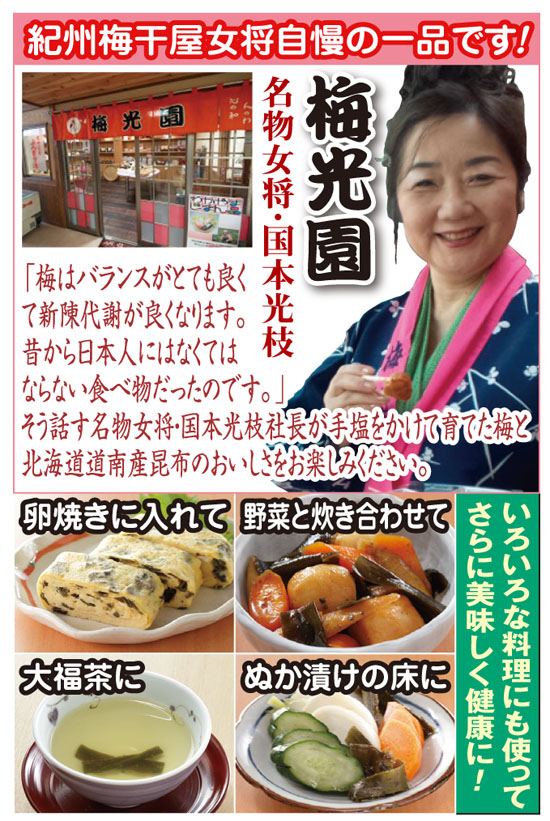 北海道産昆布と紀州名産南高梅との絶妙なハーモニー。おいしさ満点が自慢のキューンと嬉しい健康珍味です。北海道産の昆布に、日本一の梅の産地として名高い紀州南高梅の梅酢、梅肉パウダー、さらに鰹節エキス、ブルーベリー濃縮果汁をからめたこだわりの「おしゃぶり昆布」。昆布の旨みをたっぷりと味わえ、梅の酸味がアクセントになり、後を引くおいしさです。お茶受けに、またお酒のおつまみに。ローカロリーで栄養満点。美味しくて体に良い、まさに一石二鳥の珍味です。また、お湯に梅ほし昆布を入れて味わいを楽しむ「大福茶(おおぶくちゃ)」や、酸味と旨味の効いた玉子焼き。さらには野菜と一緒に炊き合わせたり、またぬか漬けの床として、お料理にも幅広く活用できます。甘いお菓子や脂っこいおつまみと比べて大幅にカロリーセーブでき、カラダにもうれしい健康珍味です。一袋たっぷり40g×10袋セットの大ボリュームで、毎日たっぷり楽しめます。食べると止まらない美味しさが自慢の、紀州梅干し屋「梅光園」女将の自慢の一品。「梅はバランスがとても良くて新陳代謝が良くなります。昔から日本人にはなくてはならない食べ物だったのです。」そう話す名物女将・国本光枝社長が手塩をかけて育てた梅と北海道産昆布のおいしいハーモニーをお楽しみください。