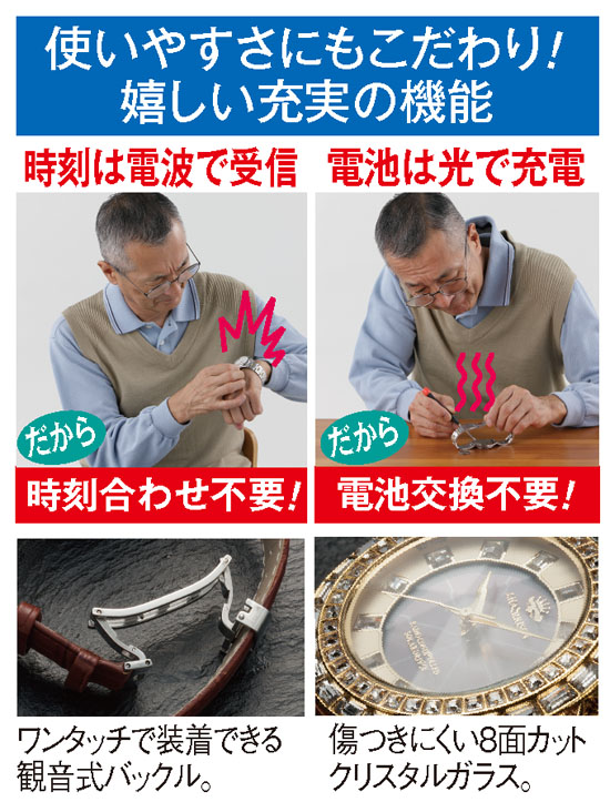 まるで宝飾品のようなゴージャスな腕時計で、周りの方の視線を釘付けにしませんか。クリスタルガラスをふんだんに散りばめることで、あふれる華麗な輝き。さらに牛革ベルトが大人らしい高級感を添えます。しかもソーラーシステムを搭載しているので、太陽光や室内灯でも充電でき、電池交換も不要。電波式でいつも正確な時刻を表示し、時刻合わせの必要もありません。また手洗い時など、水滴を気にしなくて済む日常生活防水仕様。手首サイズに合わせて一度セットすると、ワンタッチで着脱できる観音開き式バックルなど、便利な機能を搭載しています。ゴールド、シルバーからお好きな方をお選びください。