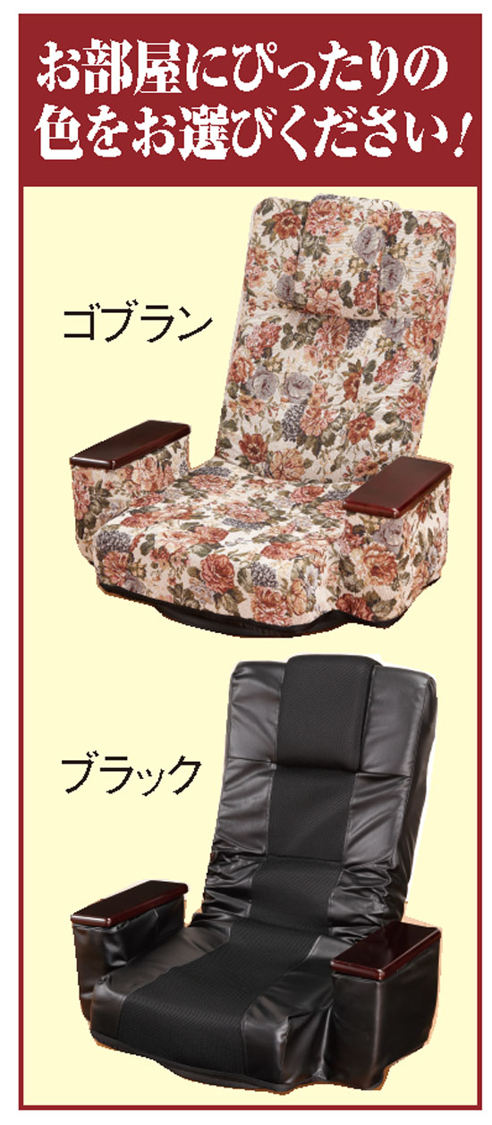 くつろぎの時間に欠かせない便利な座椅子。だからこそ、座り心地が快適で使い勝手の良い確かなものを選びたいものです。そこでご紹介するのが、この回転座椅子です。座面や背もたれに施された絶妙な凹凸が身体をやさしく包み込むので座り心地は夢心地。一度座ったらもう離れられません。使い勝手も抜群で、両サイドの天然木の肘掛けは開閉式の収納ポケットで、テレビのリモコンや眼鏡などの収納に大変便利。サッと開ければすぐに取り出せるので、わざわざ取りに立つこともありません。背もたれは5段階のリクライニング式で、テレビや読書などにぴったりの角度調節ラクラク。本体はクルクルと360度回転するので、周りのものを取りたい時などに便利です。シックで落ち着きのあるブラックと、華やかなゴブラン柄の2色をご用意しましたので、お部屋にぴったりの1色がお選びいただけます。