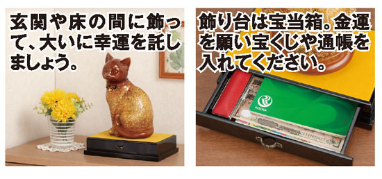 古来より「招き猫」で知られるように、猫は商売繁盛や金銀財宝をもたらす霊力があると信じられ、特に商家では大切に扱われてきました。また風水では、富貴の象徴として黄金色が尊ばれています。そこで今回ご紹介するのが、黄金装飾のきらびやかな衣装を纏った金運猫の置物です。特製の首飾りには、幸運を呼ぶといわれる金色の鈴とともに、金運石として人気の高い、虎目石も配しました。さらに台座は、金運が上昇するといわれる黄色の天板で、引出しの付いた宝当箱となっています。宝くじなどをしまっておけば、一獲千金の大きな夢をもたらしてくれるかもしれません。玄関や床の間など家の大事な場所に、ぜひお飾りください。神秘的で趣き深いインテリアとなり、なによりの開運祈願ともなります。親しい方への新築や開店などのお祝い品としても最適です。