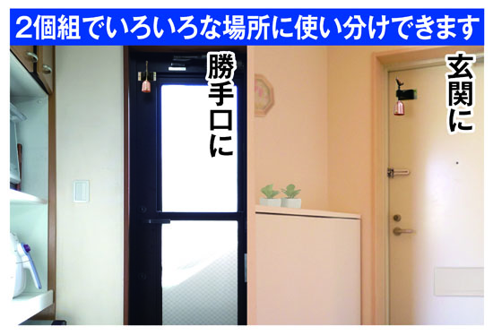 お洒落なお店の扉を開くと聞こえてくる「チリンチリン」という心地良い呼び鈴。そんな心やすらぐチャイムが自宅の玄関にもあったらいいな、という多くの方のご要望にお応えしたのがこの「かわいい小鳥の玄関チャイム」です。取り付けは簡単で、引き戸とドアのどちらでもOK。強力な磁石が付いているので鉄製の扉ならペタンとくっつけるだけで、木製やアルミのドアには付属シールやネジを使えば簡単に付けられます。来客がドアを開ければ心地良い鐘の音に心なごみ、楽しい時間が過ごせそうです。また、風水では玄関に銅の鐘など金属の音がするものを吊るすと悪い気を遠ざけ、良い気を呼び込む力があると言われています。近頃は何かと物騒で、防犯対策にも大活躍。鐘は日本の熟練職人が作った逸品で、見た目の美しさと自然で優しい音色も自慢です。2個組ですので玄関や勝手口などに使い分けられて便利です。