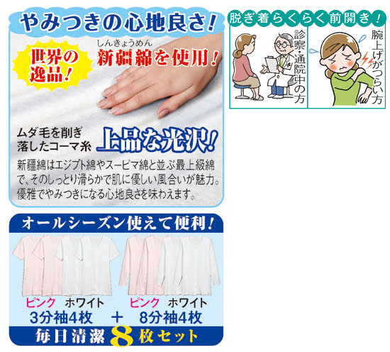 最高級の新疆綿を使用した、脱ぎ着らくらくの前開き肌着です。世界3大高級綿の新疆綿は、風合いがしっとり滑らかで、肌に優しく一度着たら手放せない心地良さ。ムダ毛を削ぎ落した格上のコーマ糸は、細く強くて光沢感があり吸湿・通気性が抜群です。前開きはサッと脱ぎ着できる便利な面ファスナーで、腕や肩が痛い方や診察時に便利。イヤな臭いを抑える抗菌防臭加工で毎日清潔です。夏用の3分袖4枚とスリーシーズン用の8分袖4枚の計8枚組で、一年中使え、洗い替えにも便利。1枚あたり1,725円の超格安値も注目です。
