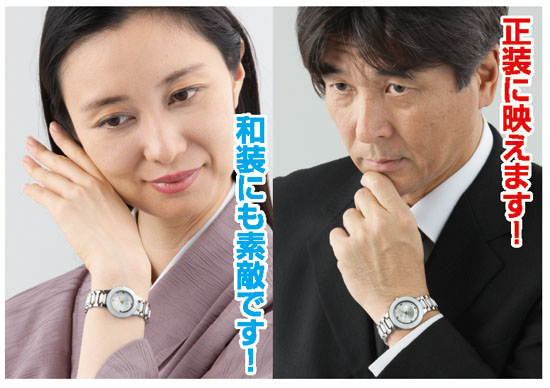 まるで象牙か陶磁器…美しく滑らかなボディがゴージャスな輝きを放ちます。歯科医療で高額な治療用に用いられるセラミックは、色が限りなく白に近く、傷つきにくく、変色しないことで知られています。そのホワイトセラミックを基調にしたゴージャスな腕時計のご紹介です。いつまでも艶やかな光沢が変わらず、新品の風合いが楽しめます。セラミック自体の美しさに加え、ケース周りと文字盤のガラスには切れの良いダイヤモンドカットがほどこされ、身につける方の動きにあわせて、キラキラと、まるでダイヤのような輝きをはなちます。文字盤にはさりげなく特選のジュエリーを配しました。紳士用は天然サファイヤ4石入り、婦人用は天然ルビー4石入りで、どちらも宝石鑑別書付きです。お申し込みの際は、紳士用か婦人用、とちらかをご指定ください。この機会に両方を申し込んで、ご夫婦ペアでご使用いただくのも素敵です。