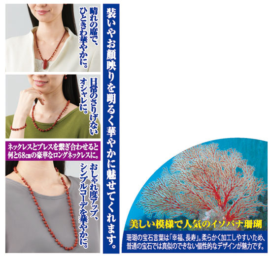 海水の高温化により絶滅の一途をたどり、それに比例し稀少価値が高まり年々人気が沸騰! 今や幻のジュエリーとまで呼ばれる、海の宝石「珊瑚」を使った贅沢なアクセサリー5点セットの登場です。古代ローマの時代より女性たちを虜にしてきたという珊瑚のなかでも、独特の美しい縞模様を持ち、軽くて装身具にぴったりのイソバナ珊瑚を使用。気品あるれるジュエリーに仕立てました。ひときわ艶やかに胸元と耳元を彩る、マーキス型ペンダントとつゆ型イヤリング。上品で飽きのこない、シンプルなネックレスとイヤリング。そして、手首を彩るブレスレットの5点セットで、ネックレストブレスレットを繋ぎ合わせロングネックレスにするなど、自由自在に楽しめます。普段のおしゃれからパーティなど華やかな席まで使え、とても重宝する琥珀のアクセサリー。5点合わせて13,900円というお求めやすさも見逃せません。今すぐお申し込みください。