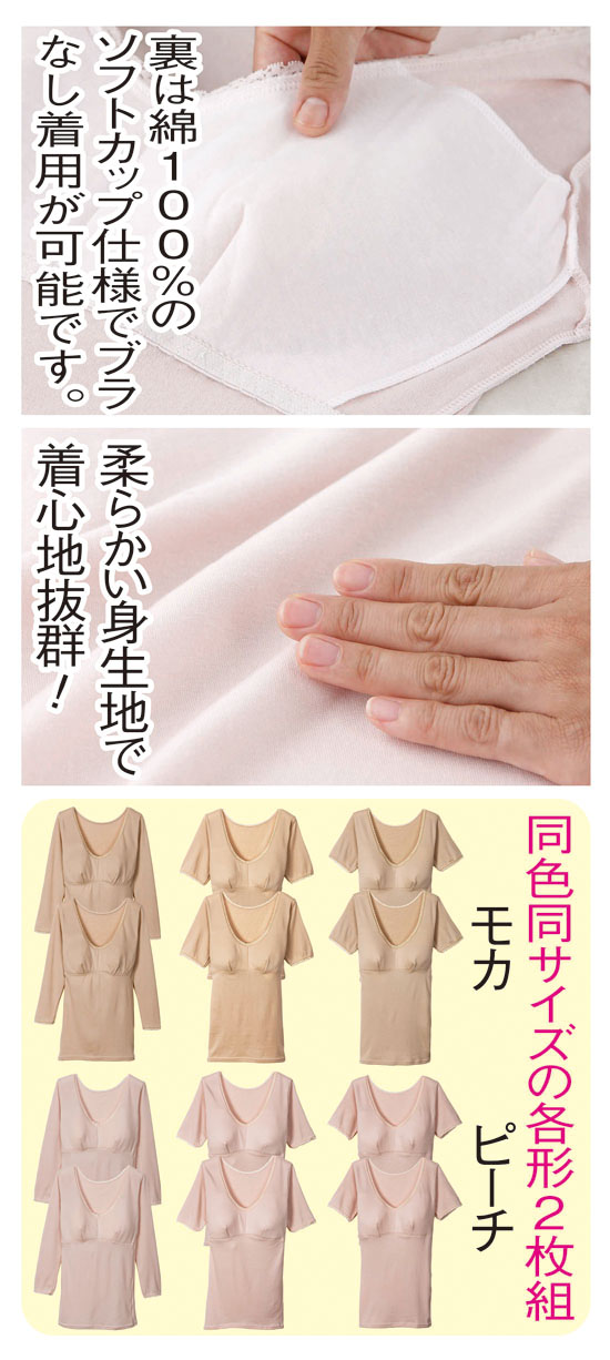 すべるようなシルクタッチの肌ざわりで、ブラと重ね着のいらないソフトカップ付き肌着。真夏を除くすべての季節に着用していただける袖丈の違う6枚組のご紹介です。毎シーズンのご好評にお応えして、袖の長さのバリエーションを3通りに増やしました。まず初秋用に5分袖が2枚、冬用に長袖が2枚、そして春先用で短めの3分袖が2枚の合計6枚組です。すべてが同じテンセル混の質感で、内側のソフトカップ部分は吸汗性に優れた綿100%で肌にやさしく、品質も日本製だから安心です。最近の洋服は冬といえども薄手のものが多く、そのインナーともなれば重ね着は面倒でアウターにひびきます。ぜひ、この便利なブラ無しの肌着をお試しください。