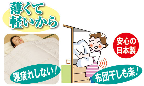 羽毛布団は暖かいけど値段がちょっと…。羽毛や羊毛のあの臭いが苦手…。そんなご不満をお持ちの方に自信をもっておすすめするのが、この「羽毛の2倍暖か中材使用掛布団」です。暖かさの秘密は、超極細繊維の間に暖かい空気を溜め込んで羽毛の約2倍の保温力を発揮する高機能中わた素材「3MTMシンサレートTM」と、中わた繊維に遠赤外線放射セラミックスを練り込んだ「ウォーマルR」混わたで、そのWの効果で驚くほどポッカポカ! サッと1枚掛けるだけで段違いの暖かさを実感し、朝までぐっすり眠れます。もちろん、羽毛や羊毛などの特有の臭いがせず快適で、しかもお求めやすいお値段も魅力。同サイズの市販の布団とくらべて薄さと軽さにも優れ、圧迫感がないので寝返りしやすく、一度使ったらもう手放せません。本格的な冬の訪れももうすぐですので、この機会にぜひご準備ください。