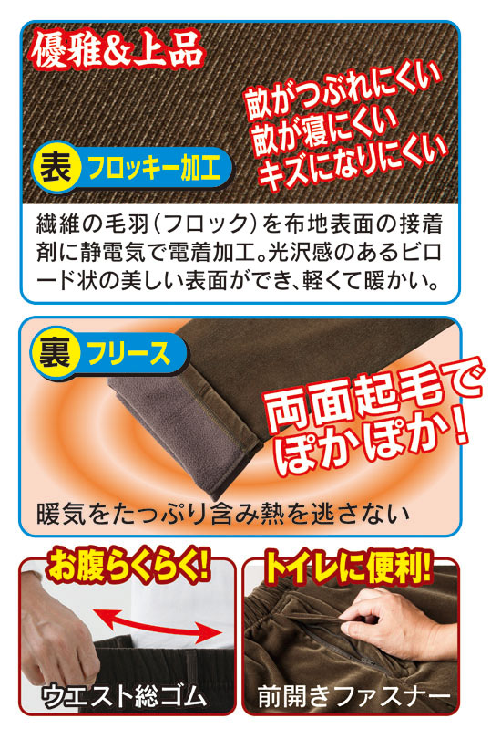 秋冬の寒い朝の着替えも快適。はいてすぐにぽかぽかのコール天調お洒落パンツです。表地はポリエステルの布地にナイロンの毛羽を電着させたフロッキー加工で、従来の綿コール天に比べて軽く、柔らかく、暖かいのが特徴。コール天の畝がつぶれたり、寝たりすることもなく、ビロードのような美しい光沢を放ち、優雅で気品に満ちています。裏地は毛足の密度の濃いフリース起毛。両面起毛の暖かさで、足を通したとたんに暖気に包まれ、ヒヤッとすることもありません。ウエストは総ゴムで、食後もお腹らくらく。後ろポケット付きで、ハンカチなど小物も入れやすく便利。ベルトループ付きですので、お出かけのお洒落もピシッと決まります。
