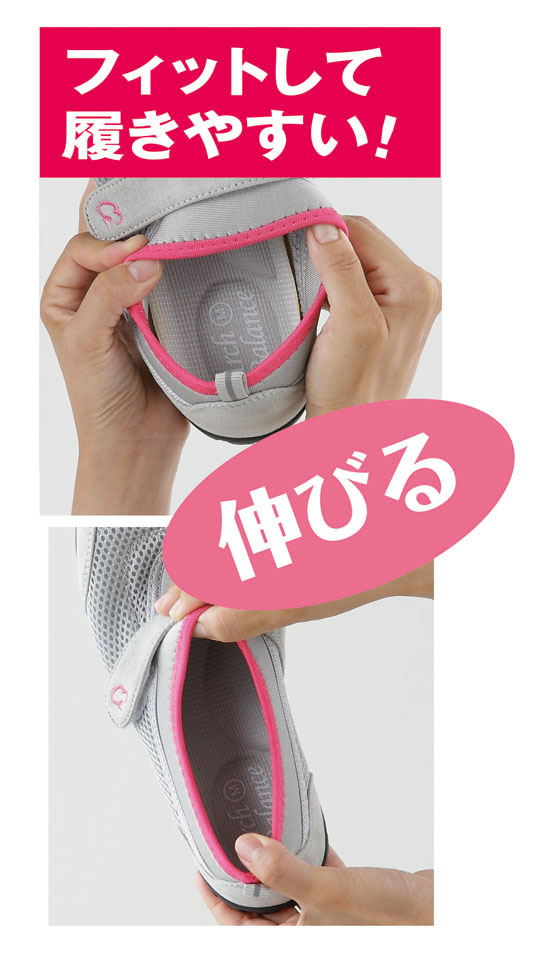履いた時の驚きの表情が今から目に浮かぶ、とにかく軽いシューズのご紹介です。履いているのを忘れそうなほど超軽量で、片足分なんと180g! 履いた瞬間からどこまでも歩いて行けそうです。靴底は柔らかくて蹴り出しやすく、安定した歩行をサポート。履き口はのびのび素材で、しかも面ファスナーなので脱ぎ履きがラクです。甲材はメッシュ素材でムレにくく、幅広4Eで外反母趾や甲高が気になる方も安心。特殊アーチインソールは足裏に優しく、長時間歩いても疲れにくく、歩行時にはクッションの役目をして膝や腰を衝撃から守ります。靴底はグリップ力があり、濡れた地面でも滑りにくくて安心。どんなパンツにも合わせやすいシンプルなデザインと上品な色も魅力です。今回は、ウォーキングや散歩、旅行などに使い分けられて便利な2足組でご提供いたします。