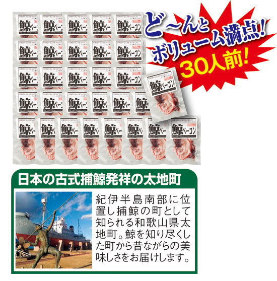 昭和の食卓を賑わせ、学校給食の人気メニューの一つにも数えられた昔懐かしい鯨のベーコン。貴重なタンパク源として重宝され、最近では高タンパク、低カロリー、低脂肪(赤身肉)で、DHAやEPAなどの栄養成分も豊富に含むことからヘルシーな食材としてあらためて注目を集めています。そこでご用意したのが、この鯨ベーコンセットです。作ったのは、日本で唯一、鯨の追い込み漁が許可され、古式捕鯨発祥の地として有名な和歌山県太地町で、美味しさは折り紙つき。地元の老舗が伝統製法で丹念に仕上げているので、昔ながらの美味しさが存分に楽しめます。袋を開けたらそのままいただけて、ご飯のおかずはもちろん、お酒のあてにも良く合い、チャーハンやサラダ、炒めものなどにもおすすめです。ドーンと30袋まとめて冷凍便でお届けしますので、めったにないこの機会をお見逃しなく、ぜひお買い求めください。
