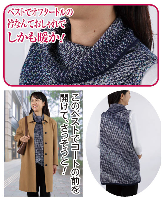 ニット製品にはデザインにこだわったものが多く、特にニットの出番が多くなる秋口には個性豊かなニットたちでいっぱい。そんな中、ニットに愛着を持つ国産メーカーのユニークにデザインされたベストを紹介します。人気の絣糸をふんだんに、しかもバイアス柄に配し、グラデーションを起こした編地が新鮮。衿はミセスに人気で季節にふさわしいゆったりしたオフタートルで、暖かさもありラップ調の前合わせとマッチして都会的でフェミニンな印象です。一見するとベストとは思えないような個性的なデザインですが、ニット好きの方ならコレクションアイテムとしてもおすすめです。黒系とブルー系、どちらもきれいでシックな色合いの組み合わせでお楽しみください。