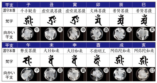 貴方の御守本尊の梵字が刻まれた天然守護水晶とともに、幸運をもたらすといわれる「向かい干支」の天然守護水晶を配した開運ブレスレットの逸品です。古来より向かい干支は自分の干支とは真逆の性質を持っているとされ、自分にはないパワーを与えてくれる「守り干支」とも呼ばれています。今でも噺家や俳優の一部の方々は、着物の柄や持ち物に「向かい干支」をあしらい、さらなる開運を願っているといわれます。本品は、そんな縁起の良い「向かい干支」を天然水晶に刻印し、十二支を並べた際に守護本尊の梵字の向い側にくるように配しています。さらに、その回りに配したのは黄水晶と呼ばれる金運石のシトリンで、風水で金運カラーとされる黄色い輝きは、富貴や繁栄をもたらすといわれています。この2つの水晶が一つのブレスレットに収まることで、より強力な力を発揮することでしょう。どうぞ毎日身につけて、さらなる金運・招福を力強く念じてください。