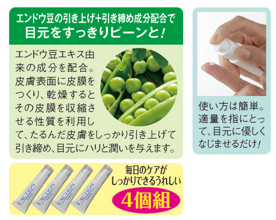最近、目袋のたるみが気になる…。若々しい頃の目もとが懐かしい…。そんな気になる目もとのお悩みを、ひと塗りで解消してくれる目袋美容液のご紹介です。製造元はパリジェンヌも厚い信頼を寄せる自国フランスの化粧品メーカーで、世界40ヵ国で販売されている大人気商品。成分はフランス産エンドウ豆のエキスで、塗って寝るだけで気になる目袋のたるみやミゾを引き締め、若々しくて美しい目もとを蘇らせてくれます。さらに、11種類の植物エキスを配合しているので、しっとり瑞々しい潤いとハリも与えてくれます。無香料、無着色、パラベン不使用、鉱物油不使用でお肌に優しく安心安全。うれしい4個組でお届けしますので、毎日の目もとケアにお役立ていただけます。朝起きて鏡を見た時の、若々しい目もとをぜひご自身でお確かめください。