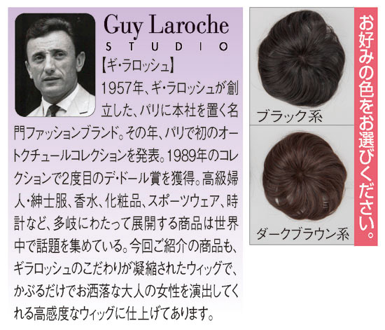 近頃、髪にボリュームがない…。髪の根元の白髪が気になる…。そんなミセスのお悩みを解消してくれるフランスの有名ブランド「ギ・ラロッシュ」のお洒落なウィッグです。髪は人毛比率を約20%まで抑え、人毛特有のうねりやクセ、パサつきを防止。もちろん、国産の合成繊維を使い人毛と変わらない質感に仕上げているので、初めてかぶってもすぐに馴染みます。髪は1本1本手植えで自然な毛の立ち上がりを実現。リアルな人工地肌も魅力です。装着はワンタッチなので簡単で、2つの留め具をパチンとするだけ。髪は長さ15cmと長めで、ポイントウィッグでありながら広い範囲をカバーします。ベースは丸くて前後左右がなく装着簡単。コテやホットカーラーが使えるのでヘアスタイルも思うがままで、お手入れはシャンプーでサッと洗えて便利です。ブラック系とダークブラウン系の2色から、お好みの1色がお選びいただけます。