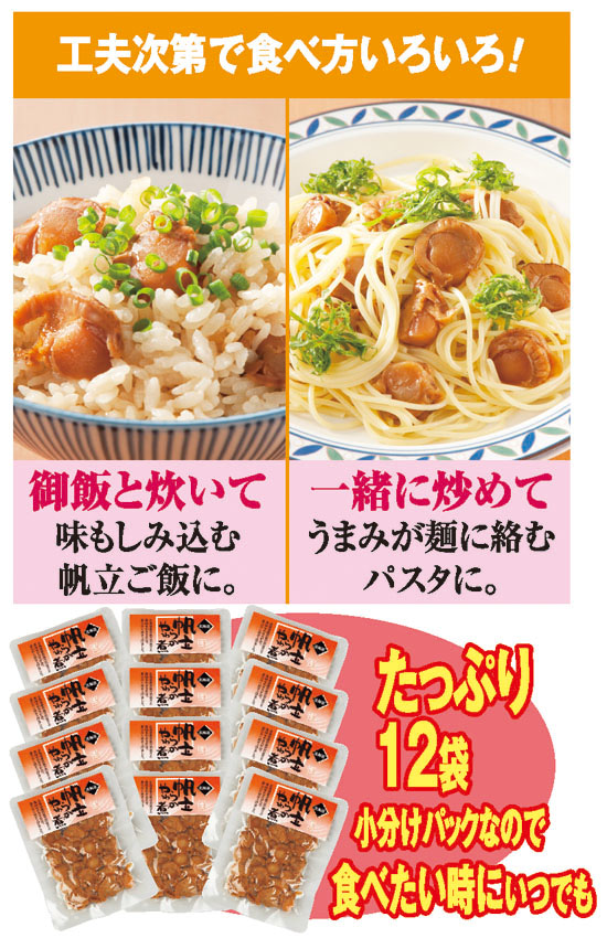 地元、北海道の豊かな海の恵みにこだわり、丹精込めて仕上げたお惣菜で愛される中水食品工業の人気商品「帆立やわらか煮」のご紹介です。帆立はもちろん北海道産で、水揚げされた良質な帆立貝を贅沢に使用。素材本来の豊かな旨みを活かすよう、あっさりと柔らかく炊き上げました。帆立はぷっくりとして食べ応えがあり、噛むほどにじんわりと旨みが溢れ出し、口福な気分にひたれます。いつものご飯にもう一品おかずが欲しい時や、お酒のあてはもちろん、アレンジ料理にもおすすめ。お茶漬けや炊き込みご飯に混ぜご飯、パスタやチャーハンなどでも美味しく召し上がれて重宝します。化学調味料、着色料、保存料は使用していない無添加商品なので安心してお召し上がりいただけます。封を切って盛り付けるだけで調理の手間がなく、すぐいただけるので大変便利です。今回は、ドーンと12袋セットでお届けしますので、北海道の帆立のおいしさを存分にご堪能ください。