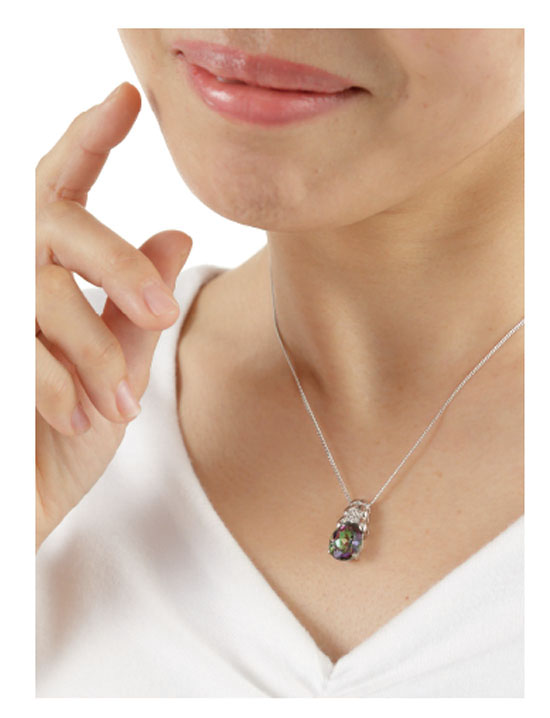万華鏡のような神秘的な美しさで私たちを魅了するミスティックトパーズを飾ったペンダントです。様々な色が混ざり合うその不思議な石は入手困難なことでも有名です。本品は、そんな希少なミスティックトパーズのしかも大粒を使用した贅沢なペンダント。胸元で虹色の輝きが圧倒な存在感を放ち、人々の視線を独占しそうです。バチカン上部にはダイヤのようなキュービックジルコニアが配され、貴方の魅力を最大限まで引き立てます。