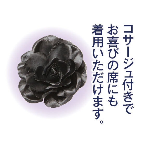 夏の慶弔時などに重宝する、シックで女性らしい印象のワンピースです。おすすめのポイントは、裾に向かって広がりをもたせ、3段に重ねたティアードと呼ばれるシルエット。程よい透け感が涼しげで、美しいドレープが女性らしい雰囲気を醸し出します。衿元のコードレースの刺繍とタックがアクセントとして活躍し、凛とした中にもエレガントで上品なお洒落心を感じます。シルエットはゆったりとしているので母娘で着用できるのも魅力。しかも、気になる体型をカバーします。「黒」の色合いは濃厚で高級感に溢れ、確かな作り込みの日本製ですので長くご着用いただけます。さらに、バラの花のコサージュが付いたお得感も魅力。慶弔時はもちろん、様々なフォーマルシーンでお役立ていただけますので大変重宝します。